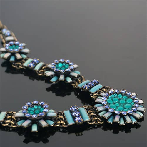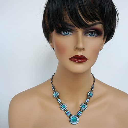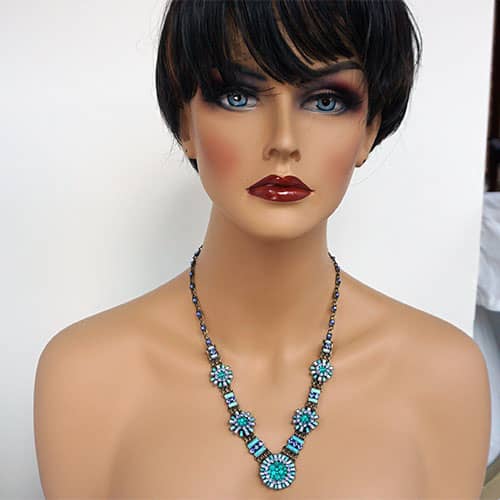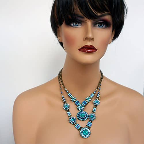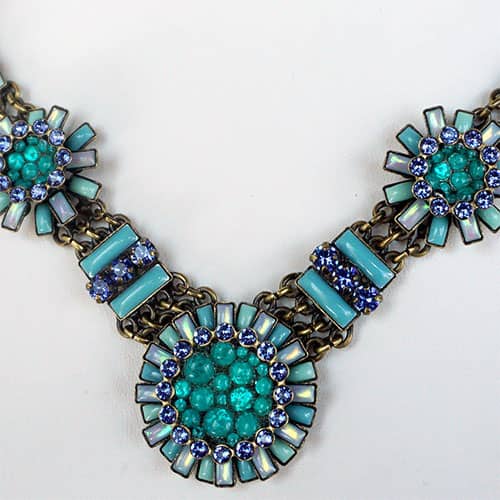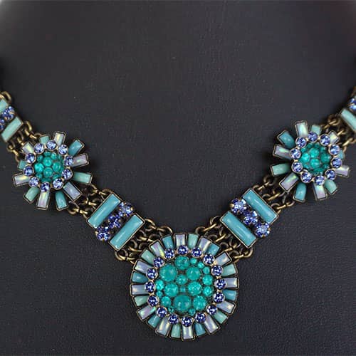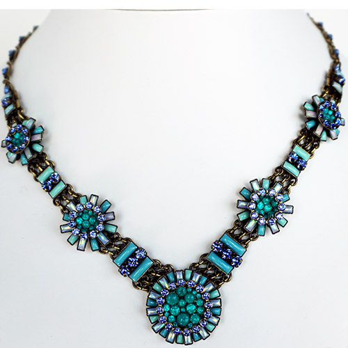 Doris Daisy necklace presents a number of "flowers" in a selection of blues. Center daisy is just over 1" diameter. The other 4 are about .75 and .5" diameter. There are sparkly blue crystals along the antique brass tone chain. The design takes up 8.5" along the front of the chain. Chain is 18" with an additional 3" extender. Please see photos of life size model for an idea of how it will fall. Closes with lobster clasp. Ifyou really wanted to make a statement, you could wear all three Daisy necklaces together.