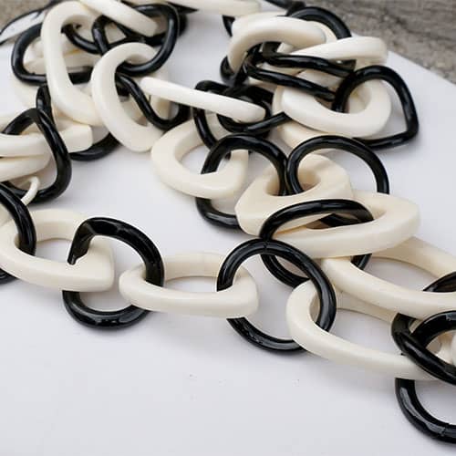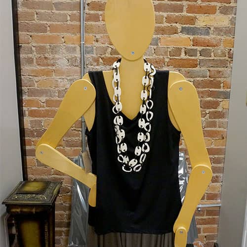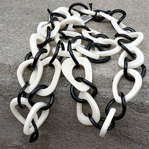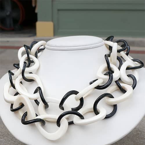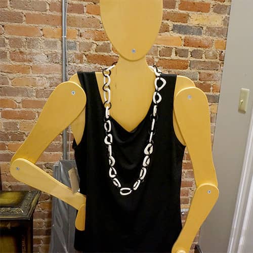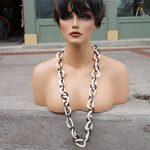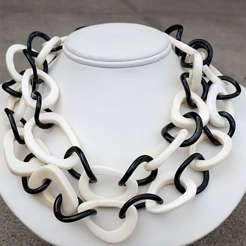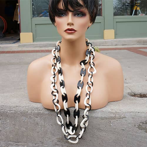 Some drama for the little black dress. Made of horn and bone. Wear it as a single strand, or if you have one of those strand catcher things you can make it a double strand. Slips over the head. If I lay it out flat, it will meaure 17", so it is 34" long. But please, and i'm begging you, take a moment to look through the detail images to get a better idea of where it will fall when worn. The limbless model is life size. The wood lady is about 5'6" ish. Bone links vary in size, but average is 1.25 - 1.5" long and 1" wide. Horn links are an irregular 1" diameter on average.
