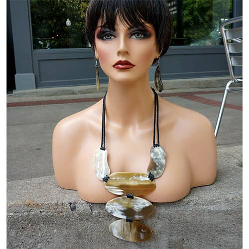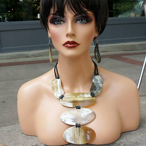 WARNING....not for the timid. People are going to look your way when you enter the room. If you are uncomfortable with attention, this is not for you. But I love it. So it might be mine. Adjustable by adjusting a horn "keeper" along the black leather cords. The front center drop is 6.25" long, made of 3 oval shaped pieces of horn; 4.25" x 2, 4" x 2", 3.5" x 2". But please, and i'm begging you, take a moment to look through the detail images to get a better idea of where it will fall when worn.