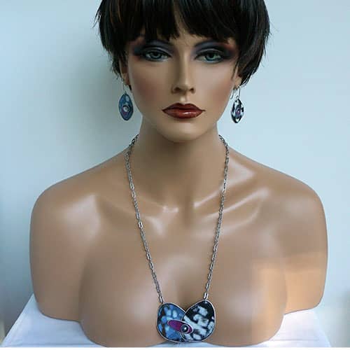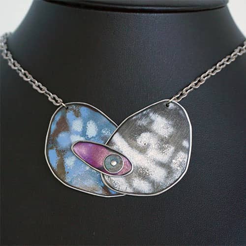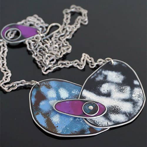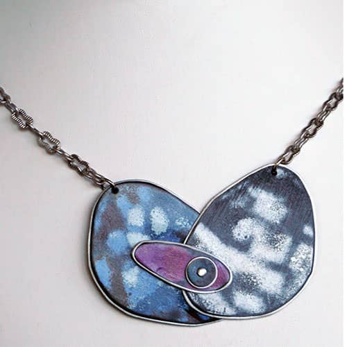 Peggy Petrey's abstract jewelry is created in much the same manner as her mixed media work. In this instance, she begins with discarded license plates onto which she layers enamel colors and then exposes the rough segments of each layer to create a wonderful explosion of abstract color. Every single piece is a one-of-a-kind piece. You will not see your exact necklace or earring on anyone else. Even the earrings you wear will not be identical to each other. Created in Tennessee.