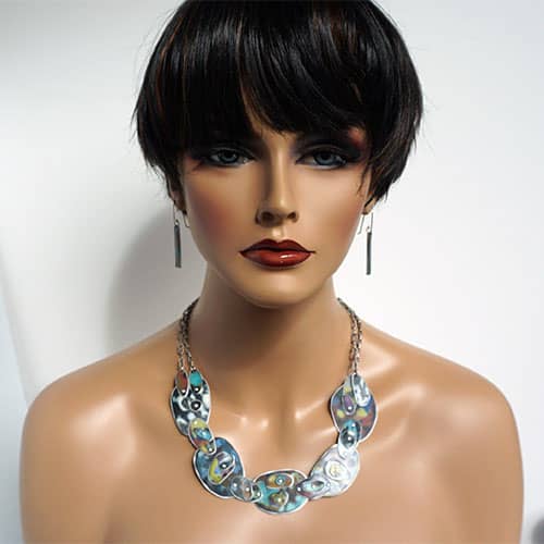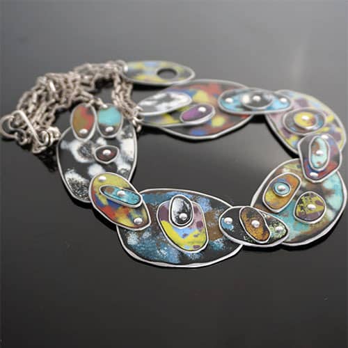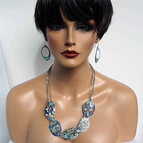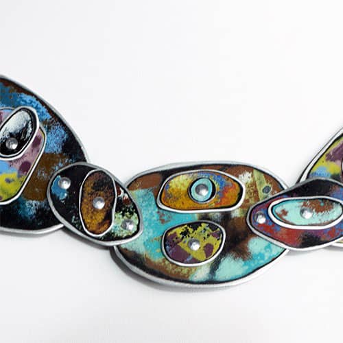 Peggy Petrey's abstract jewelry is created in much the same manner as her mixed media work. In this instance, she begins with discarded license plates onto which she layers enamel colors and then exposes the rough segments of each layer to create a wonderful explosion of abstract color. Every single piece is a one-of-a-kind piece. You will not see your exact necklace or earring on anyone else. Even the earrings you wear will not be identical to each other. Created in Tennessee.