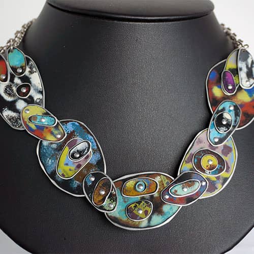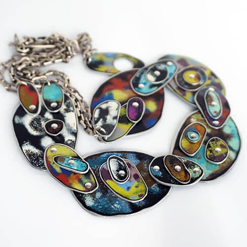 This statement piece is a Kaleidoscope of "look at me" shape and color. The pieces are articulated. Approx. 20" long. Closes with Peggy's handformed hook closure into coordinated license plate keyhole. Adjustable from 20" - 24". The colorful design is 10" long and 1.25" wide.