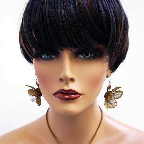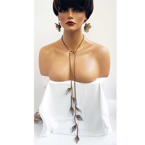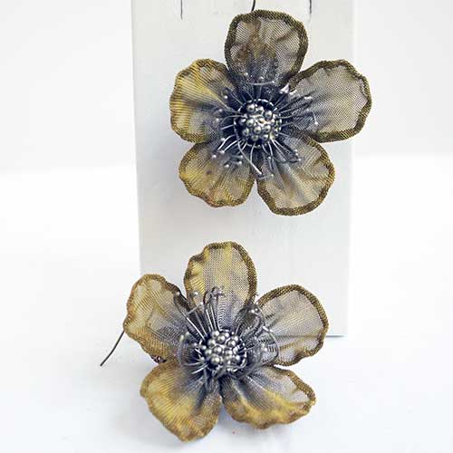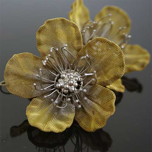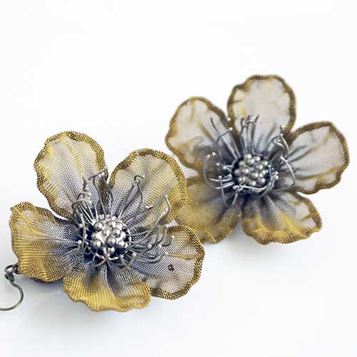 Sarah Cavender Metalworks utilizes a variety of metal meshes with screenings and knits being primarily industrial in origin. Chain and jewelry finding components complement their design philosophy. The flower and leaf collections are hand formed from sheets of brass wire cloth, and all products are hand soldered, plated, oxidized and finished on the premises, They hand paint the jewelry and accessories with colors which are custom mixed of bronze powders and dyes, and apply them in their studio.
