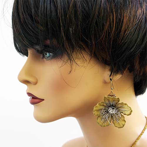 Cherry blossom bloom earrings are 2" diameter and 2.5" long from the center of the ear wire curve. Antique brass with andtique silver center.