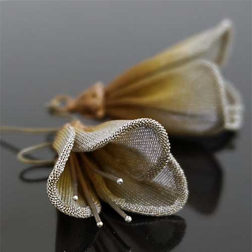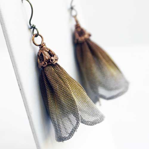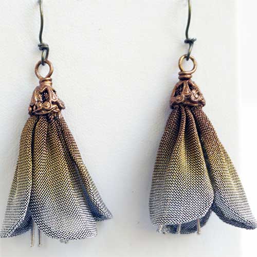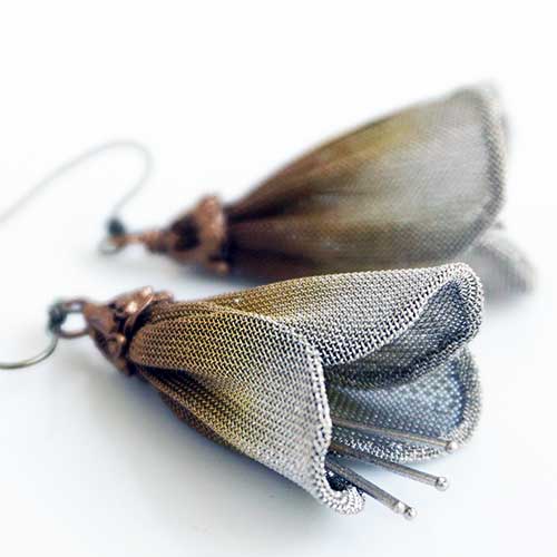 Sarah Cavender Metalworks utilizes a variety of metal meshes with screenings and knits being primarily industrial in origin. Chain and jewelry finding components complement their design philosophy. The flower and leaf collections are hand formed from sheets of brass wire cloth, and all products are hand soldered, plated, oxidized and finished on the premises, They hand paint the jewelry and accessories with colors which are custom mixed of bronze powders and dyes, and apply them in their studio.