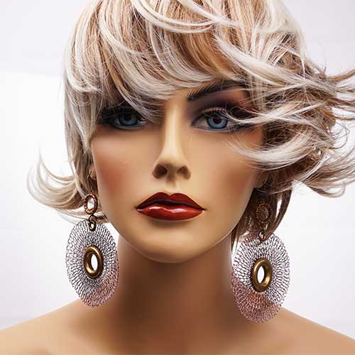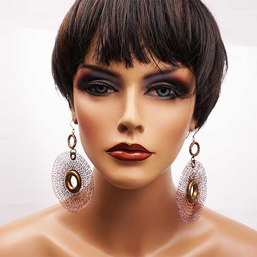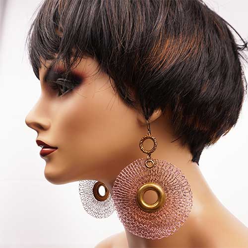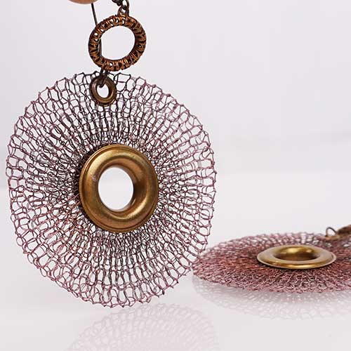 Crochet look circle earrings of industrial knit coming off a center disc, suspended from a filigree hoop. Color: Ruby pearl. Total length measured from the center of the earwire curve is a whopping 4". The disk is 3" diameter. Not for the faint of heart.