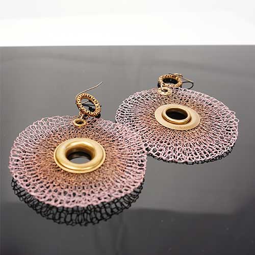 Sarah Cavender Metalworks utilizes a variety of metal meshes with screenings and knits being primarily industrial in origin. Chain and jewelry finding components complement their design philosophy. The flower and leaf collections are hand formed from sheets of brass wire cloth, and all products are hand soldered, plated, oxidized and finished on the premises, They hand paint the jewelry and accessories with colors which are custom mixed of bronze powders and dyes, and apply them in their studio.