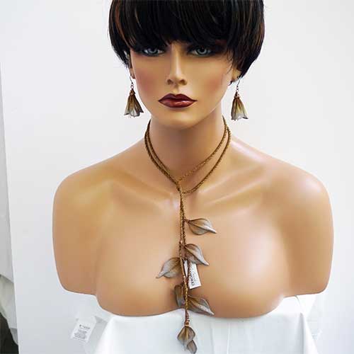 Fantastic in its simplicity. This foxtail and fine mesh leaf lariet necklace is 50" long. The leaves are antique silver. One could also wear this piece as a belt.