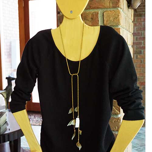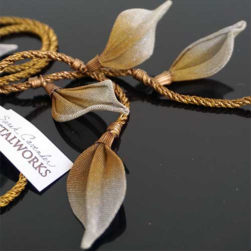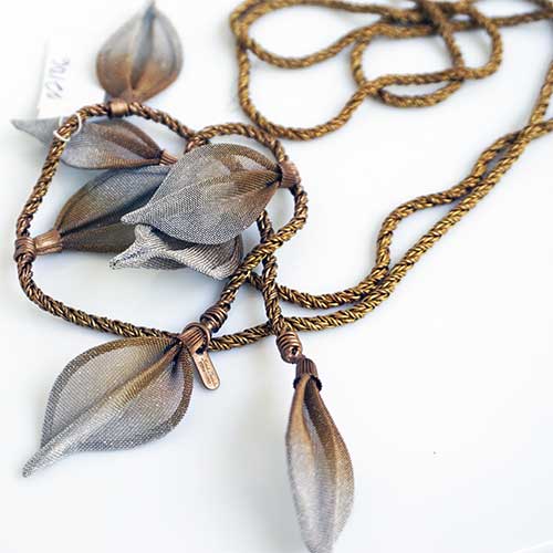 At Sarah Cavender Metalworks, we use a variety of metal meshes with screenings and knits being primarily industrial in origin. Chain and jewelry finding components complement our design philosophy. Our flower and leaf collections are hand formed from sheets of brass wire cloth, and all of our products are hand soldered, plated, oxidized and finished on the premises, We hand paint our jewelry and accessories with colors which are custom mixed of bronze powders and dyes, and apply them here in our studio.