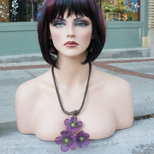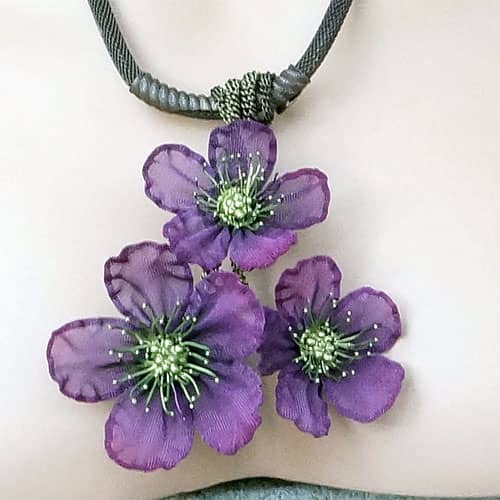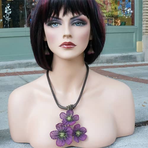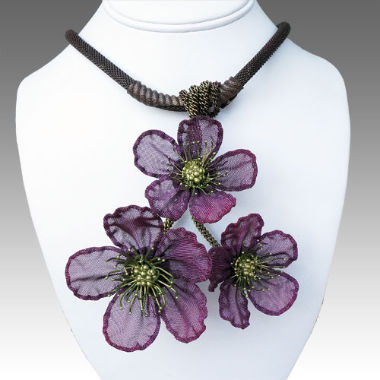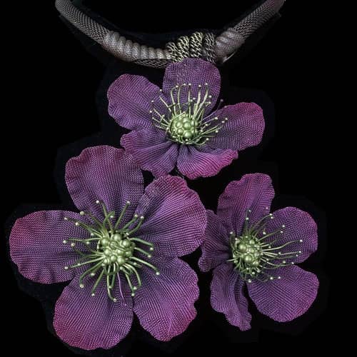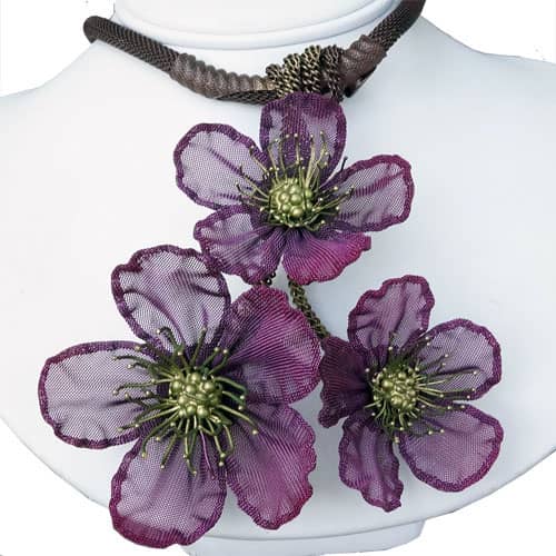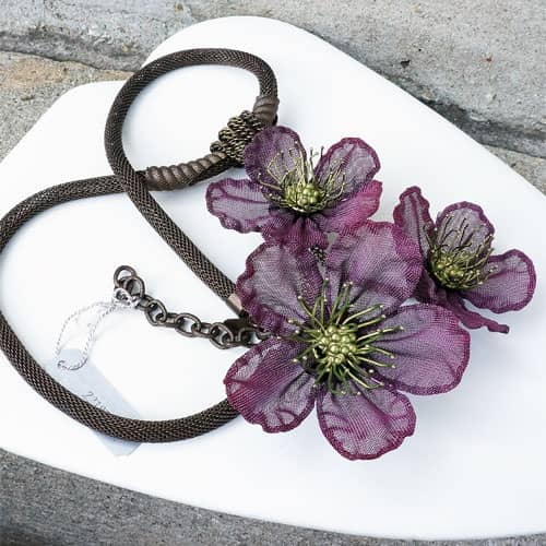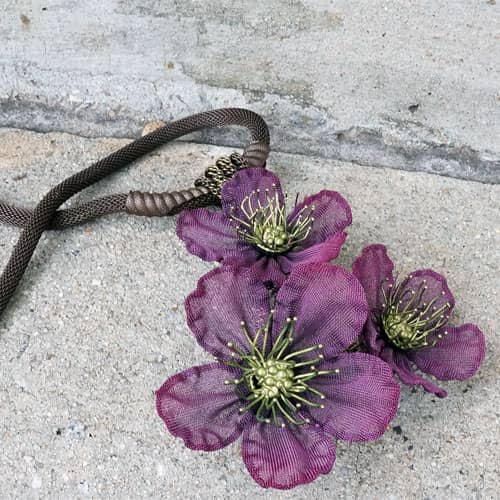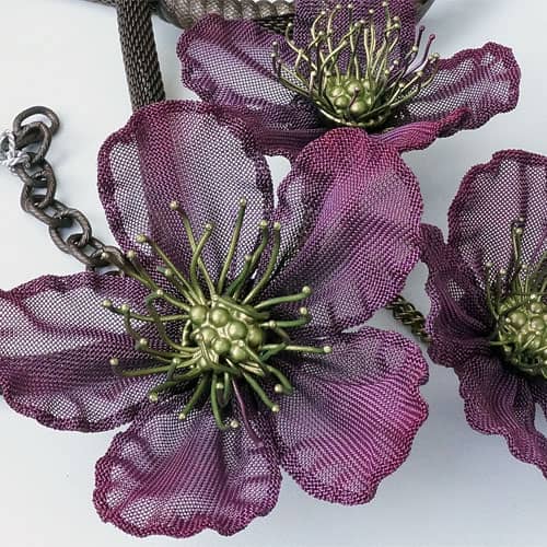 At Sarah Cavender Metalworks, we use a variety of metal meshes with screenings and knits being primarily industrial in origin. Chain and jewelry finding components complement our design philosophy. Our flower and leaf collections are hand formed from sheets of brass wire cloth, and all of our products are hand soldered, plated, oxidized and finished on the premises, We hand paint our jewelry and accessories with colors which are custom mixed of bronze powders and dyes, and apply them here in our studio.