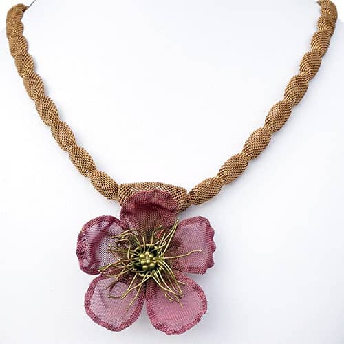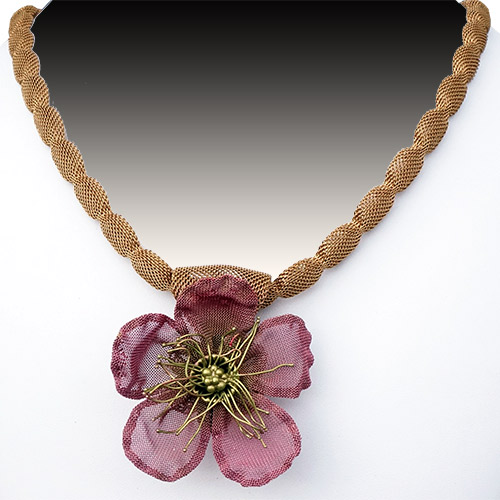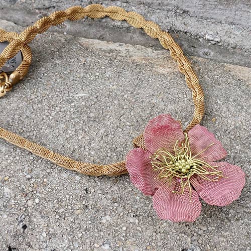 At Sarah Cavender Metalworks, we use a variety of metal meshes with screenings and knits being primarily industrial in origin. Chain and jewelry finding components complement our design philosophy. Our flower and leaf collections are hand formed from sheets of brass wire cloth, and all of our products are hand soldered, plated, oxidized and finished on the premises, We hand paint our jewelry and accessories with colors which are custom mixed of bronze powders and dyes, and apply them here in our studio.