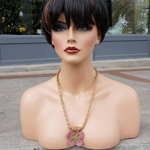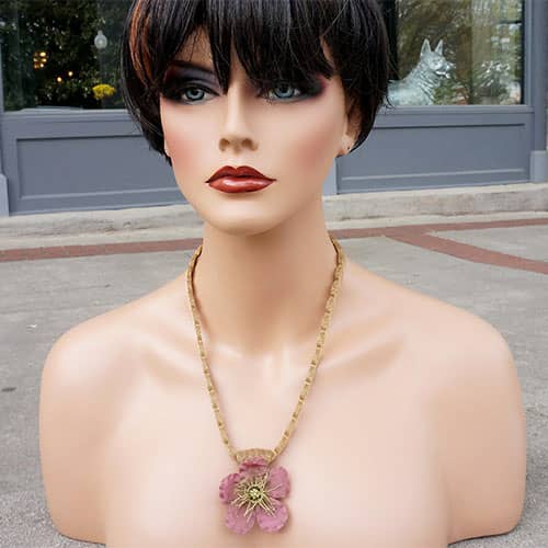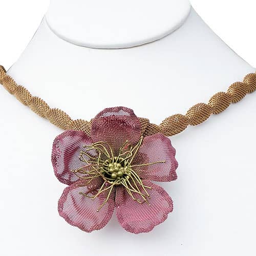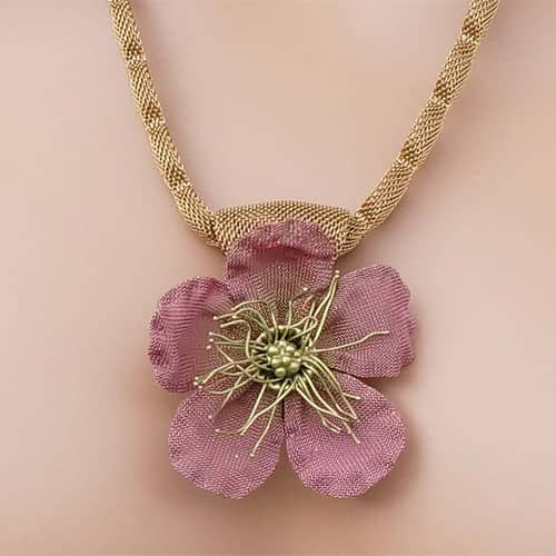 Pinched mesh chain is 20" long with an additional 3" available thanks to extender. Flower is 2" diameter and sits atop a mesh bale. Pendant will slide off if you simply want to wear the chain. Color is gold. Flower is a single color; a blend of poppy and raspberry.