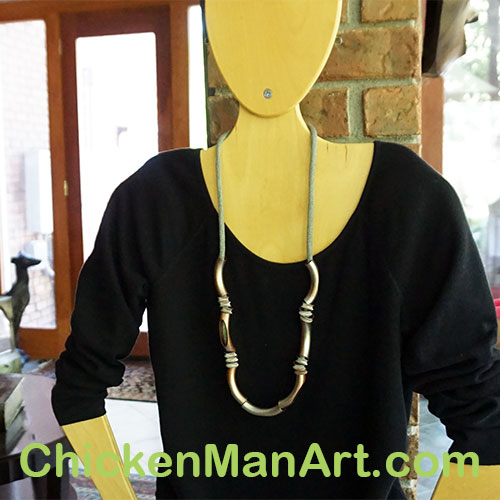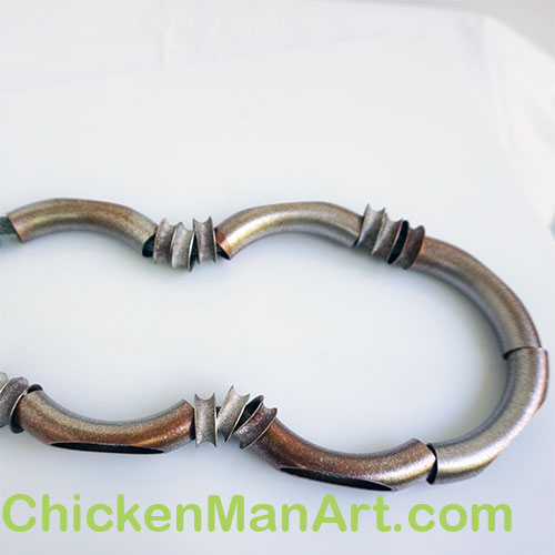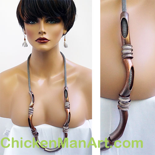 This necklace is made of industrial mesh and curved tubes, Adjustable utilizing the rings at the back. Slide the rings for the necklace to go from 24" to 34" in length. Copper and steel tones. The curved tubes are 2.25" long. Please have a look at our life size model for an idea of how it will fall when worn.
