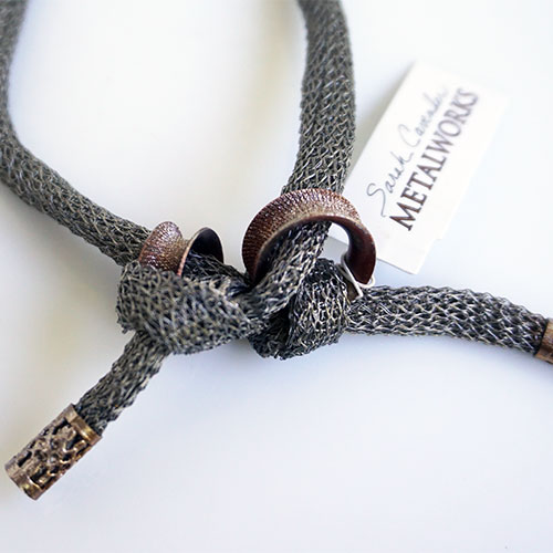 Sarah Cavender Metalworks utilizes a variety of metal meshes with screenings and knits being primarily industrial in origin. Chain and jewelry finding components complement their design philosophy. The flower and leaf collections are hand formed from sheets of brass wire cloth, and all products are hand soldered, plated, oxidized and finished on the premises, They hand paint the jewelry and accessories with colors which are custom mixed of bronze powders and dyes, and apply them in their studio.