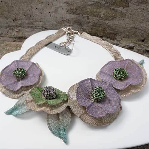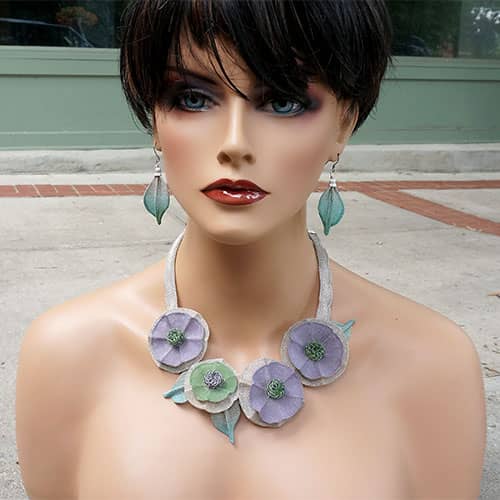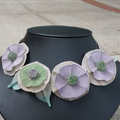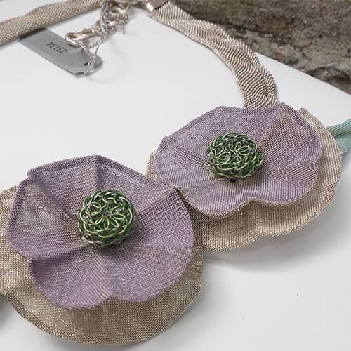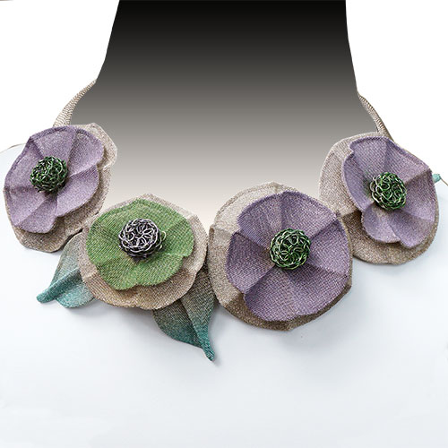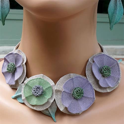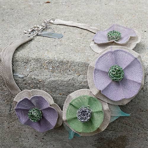 Four mesh flowers on a 1/2" woven, silver toned scalloped chain. Layered flowers are 2" diameter. It can be worn as a 16" necklace, or adjusted with the 3" extender to the length you desire up to about 19". Colors are silver with aqua (leaves), silver and lavender or silver with green flowers. Please see model for an idea of where it will fall when worn.