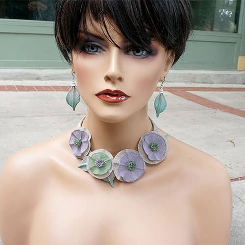 At Sarah Cavender Metalworks, we use a variety of metal meshes with screenings and knits being primarily industrial in origin. Chain and jewelry finding components complement our design philosophy. Our flower and leaf collections are hand formed from sheets of brass wire cloth, and all of our products are hand soldered, plated, oxidized and finished on the premises, We hand paint our jewelry and accessories with colors which are custom mixed of bronze powders and dyes, and apply them here in our studio.