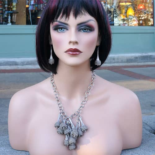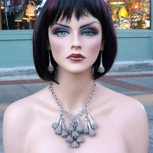 Chain tone is antique silver. Thistles are each just shy of 2". Diameter at the bottom is almost .75". Chain is 16" with an additional 3" extender chain. the center cluster of 6 thistles total about a 3" drop at the center. Photos show the necklace worn at its longest and shortest lengths.