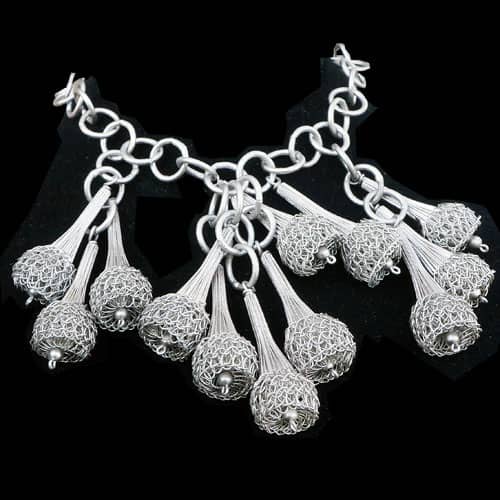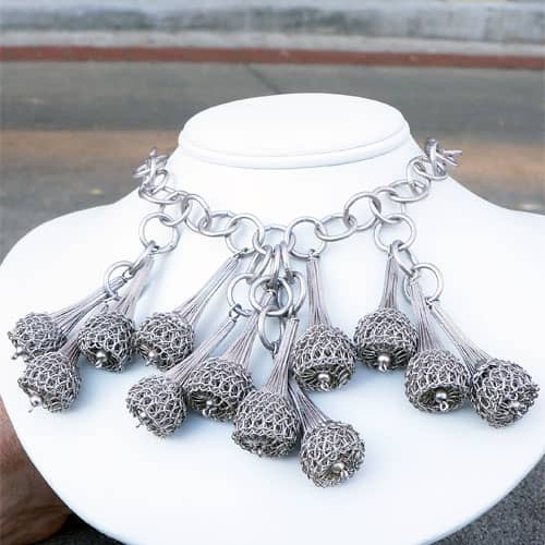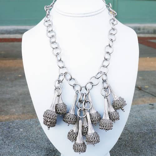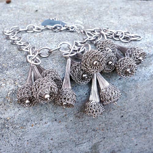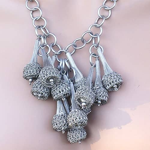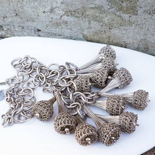 At Sarah Cavender Metalworks, we use a variety of metal meshes with screenings and knits being primarily industrial in origin. Chain and jewelry finding components complement our design philosophy. Our flower and leaf collections are hand formed from sheets of brass wire cloth, and all of our products are hand soldered, plated, oxidized and finished on the premises, We hand paint our jewelry and accessories with colors which are custom mixed of bronze powders and dyes, and apply them here in our studio.