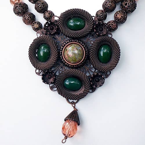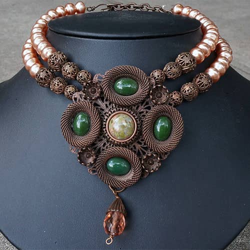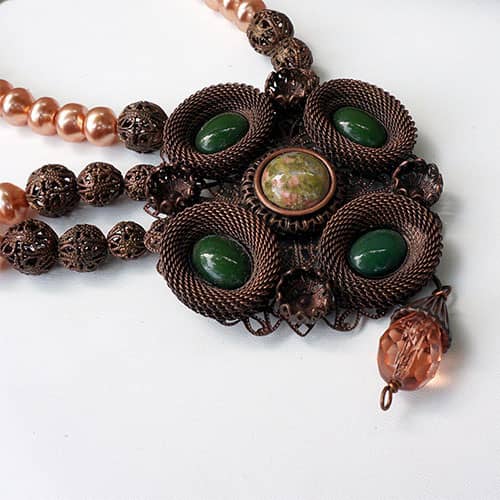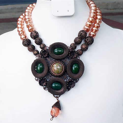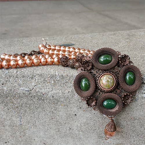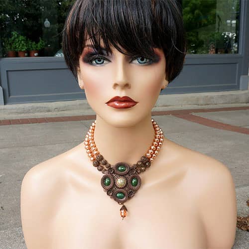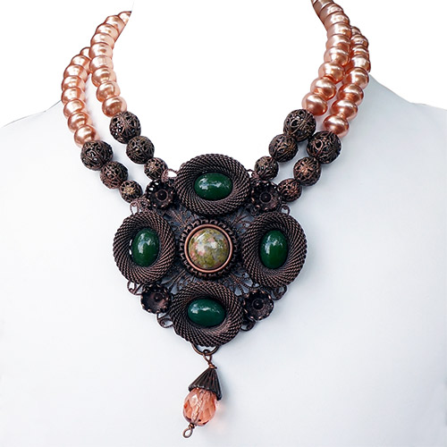 Double strand of faux pearls combined with brown tone metal present a very regal looking necklace indeed. The center focal piece is 2.75" diameter. 17" long with an additional 3.5" extender.