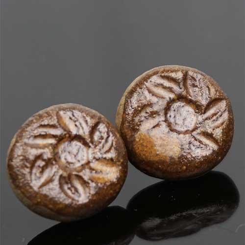 Stoneware post earrings average .75" diameter. This pair is a little smaller at .5". These were made in Teresa's studio and provide a nice compliment to a number of her necklaces. When viewing our lovely model please make allowances for her lack of ear lobes. Tends to make posts stick straight out of their heads, a bit unnatural.