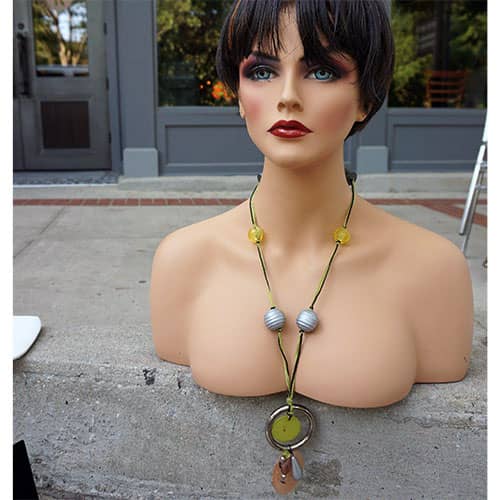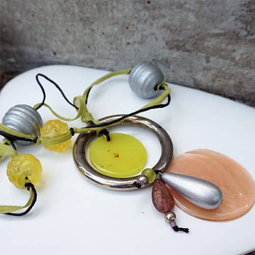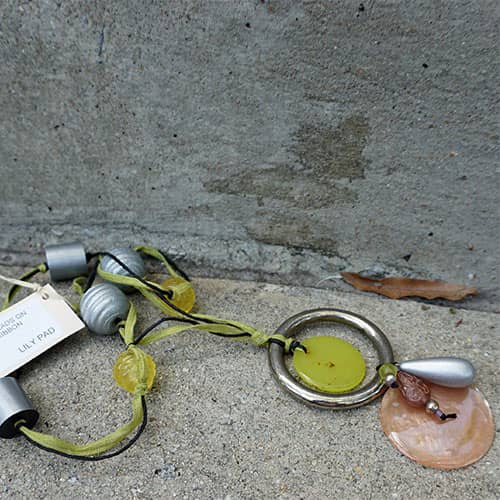 Components are natural materials mixed with vintage resin beads. some of the beads are hand dyed in her studio for specific color palettes. Certain styles contain sculpted stoneware beads fired in Teresa's clay studio.