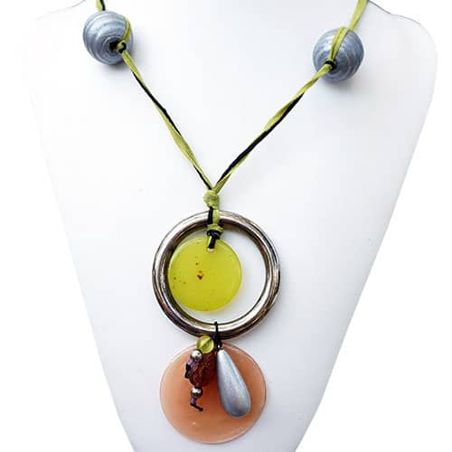 The necklace is created from glass and resin beads, strung on black linen cord with ribbon. It ties at a length you choose. Length is 47". The big round loop is 2.25" diameter. The pink resin circle at the bottom is 2" diameter.