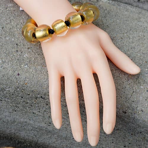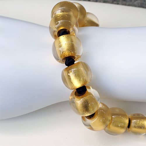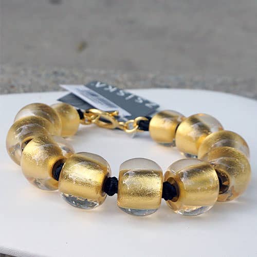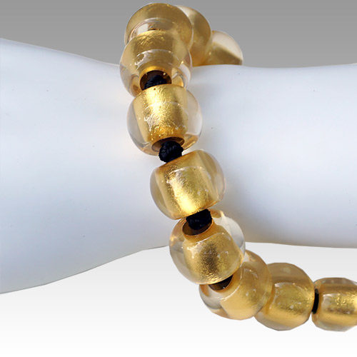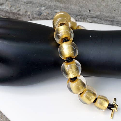A nice little bracelet providing an accent to any of the Zsiska gold bead necklaces. Closes with a toggle. Not adjustable. So - pull out one of your toggle bracelets and compare measurements. Laying flat on my table, measures 8.5" from the toggle end to the middle of the round link that the toggle goes into. There are 11 beads; 9 larger than the 2 end ones. Knotted between each bead on black silk cord.The bead part of the bracelet is 7.5" long.