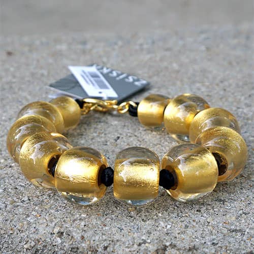 Zsiska has perfected the marriage of clear resin and 24 KT gold leaf and created a simple but bold fashion statement. The gold leaf is under the clear resin, which looks like glass.