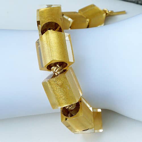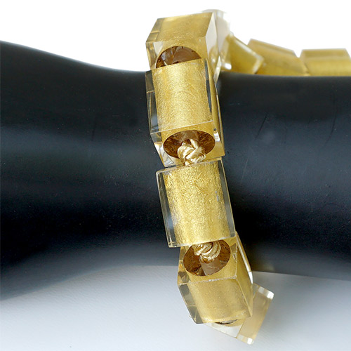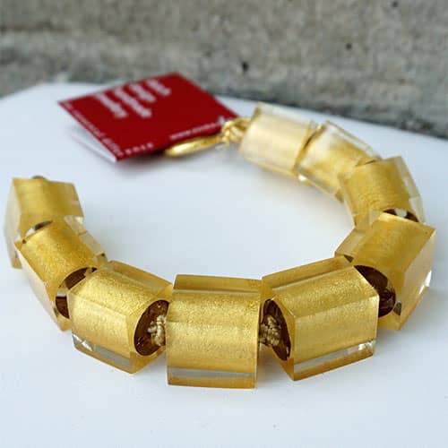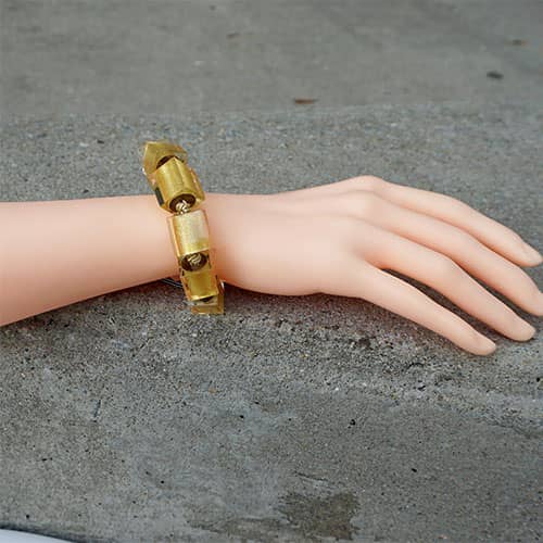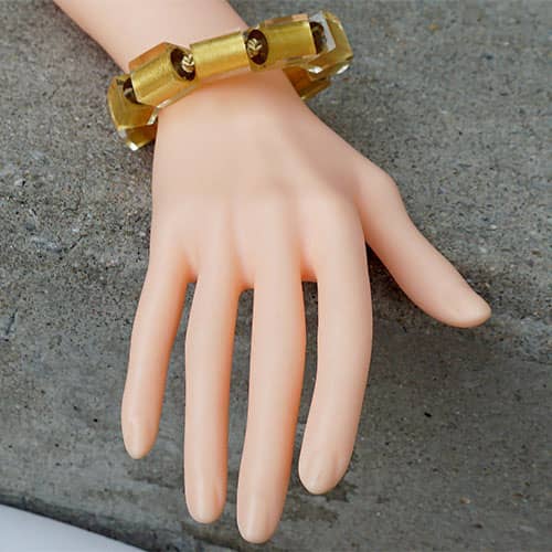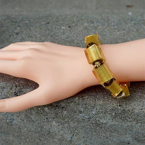 Zsiska has perfected the marriage of clear resin and 24 KT gold leaf and created a simple but bold fashion statement. The gold leaf is under the clear resin, which looks like glass.