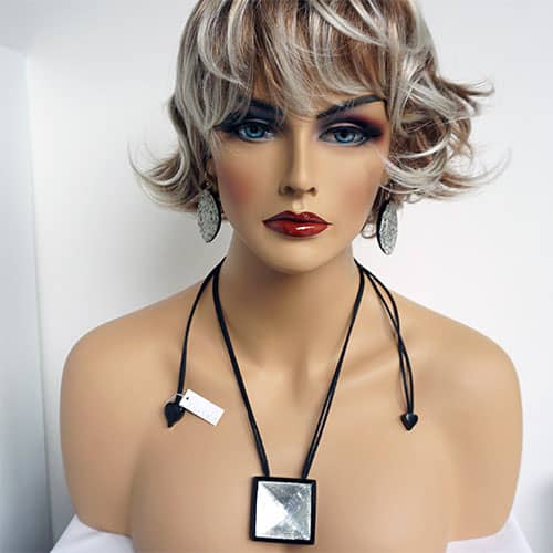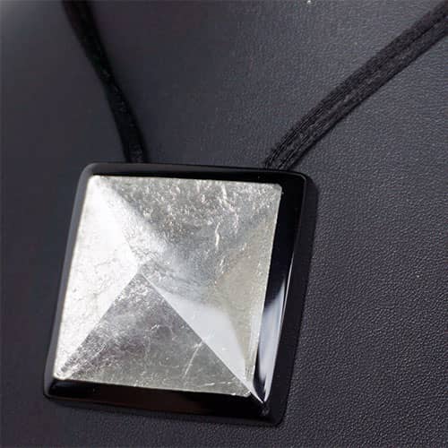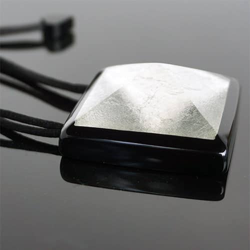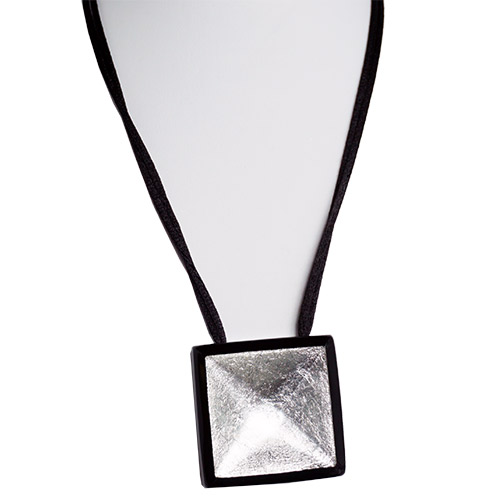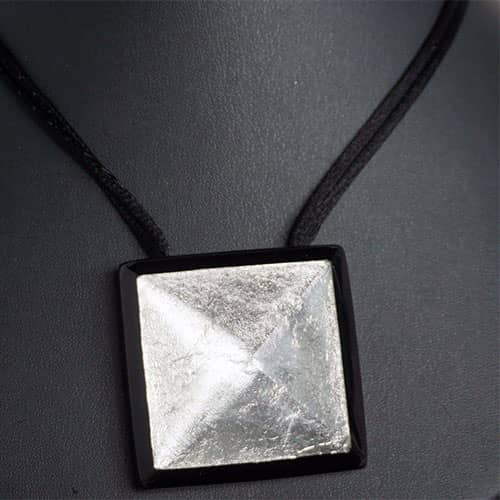 This is a great versatile piece, equally at home with a casual outfit as well as the office or dinner date . But you gotta be confident. The pendant is almost 2" square (1 14/16") On a satin cord which allows you to adjust to any length comfortable for you from long to short. The silver is under a clear resin pyramid shape dome.
