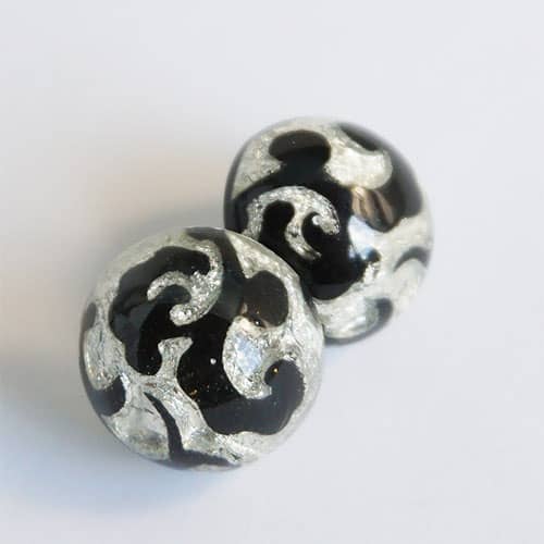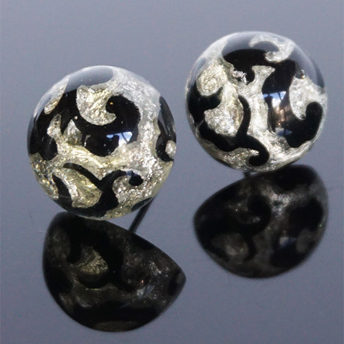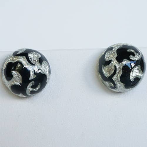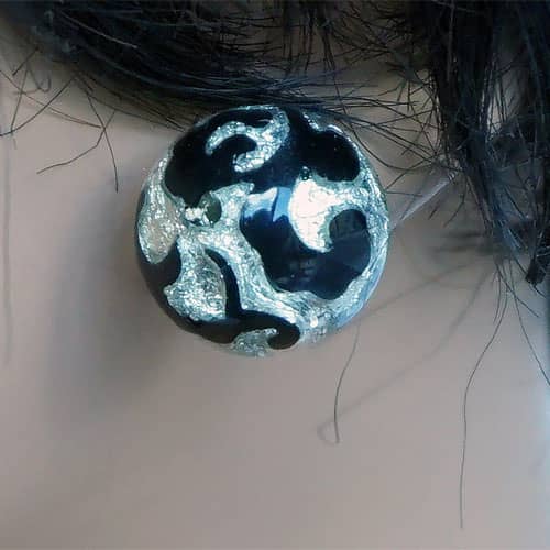 Zsiska has perfected the marriage of clear resin and silverleaf and created a simple but bold fashion statement. The silver leaf and black design is under the clear resin, which looks like glass.