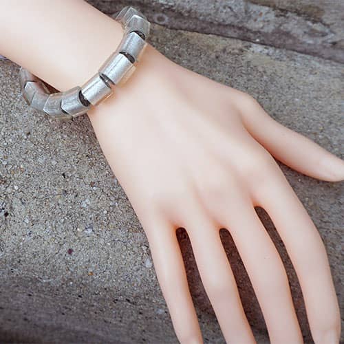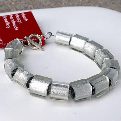 Zsiska has perfected the marriage of clear resin and silverleaf resulting in a simple but bold fashion statement. The silver leaf is under the clear resin, which looks like glass.
