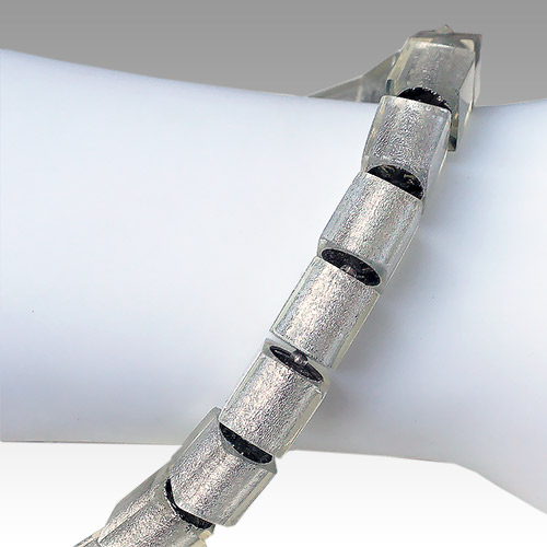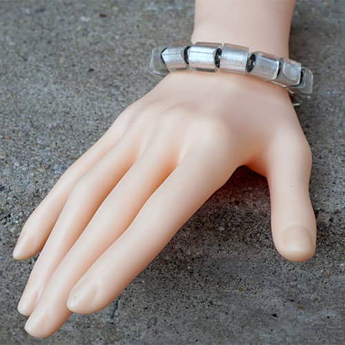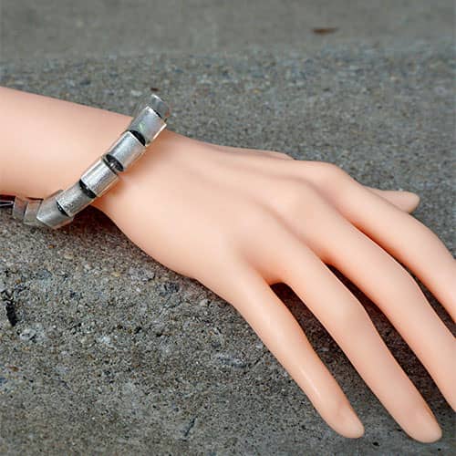 A nice little bracelet providing an accent to any of the Zsiska silver bead necklaces. Closes with a toggle. Not adjustable. So - pull out one of your toggle bracelets and compare measurements. Laying flat on my table, measures 8.5" from the toggle end to the middle of the round link that the toggle goes into. There are 14 beads: 6/16" long and wide. The bead part of the bracelet is 7.25" long.