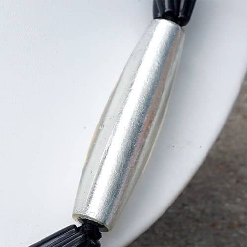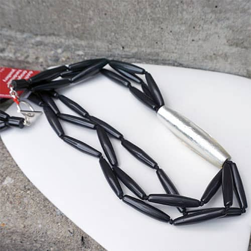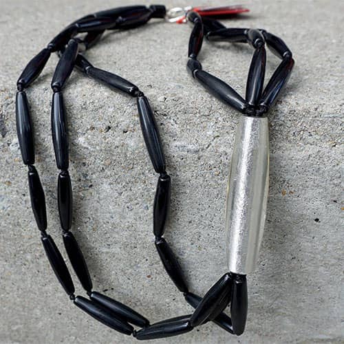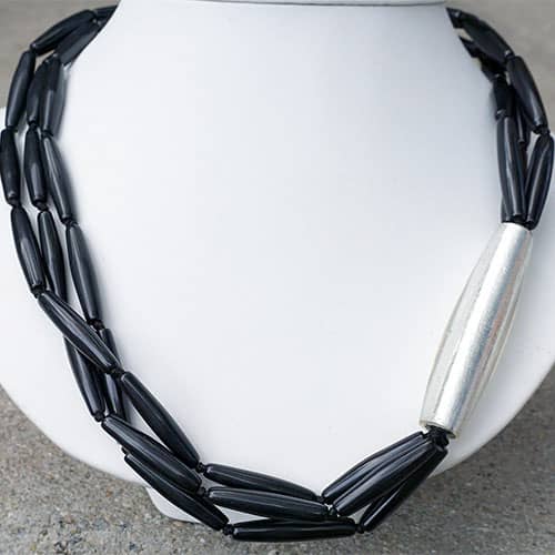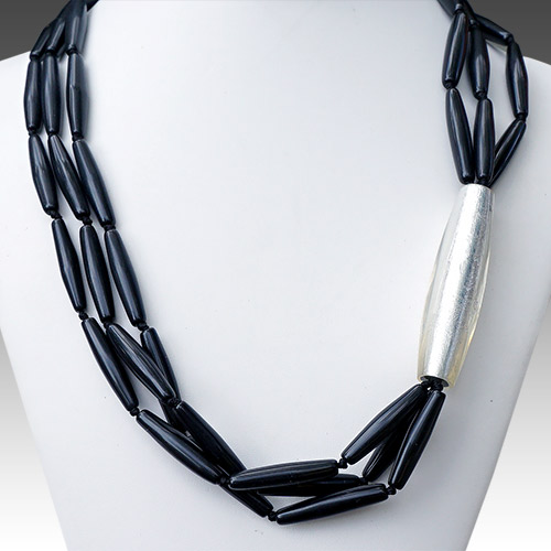 All heads will turn when you enter the room wearing this one. But they are not turning to gasp - they are turning to admire your understated elegance. Sure - some will admire the largeness of the beads, but most will wish they had your long slender neck. Three strands of simple long black resin beads with an off center silver leaf bead, 2.5" long and about .5" wide. Closing with a toggle. The necklace is 23" in length. The satin cord is knotted between each bead. 43 beads are about 1.25" long. Please view the model photos.
