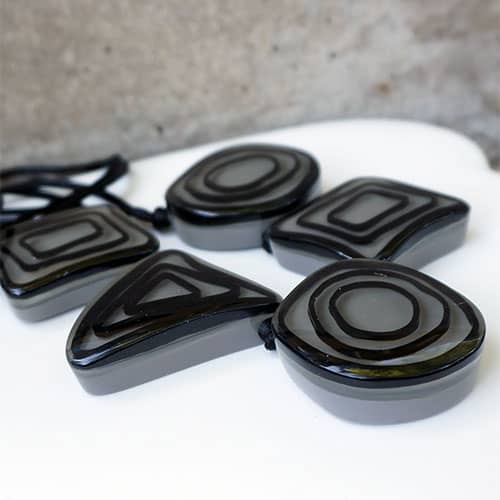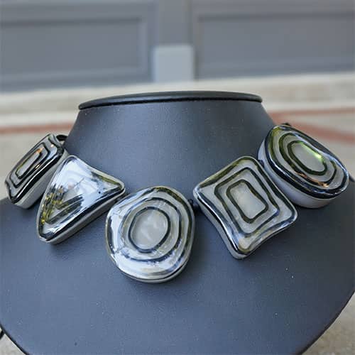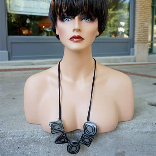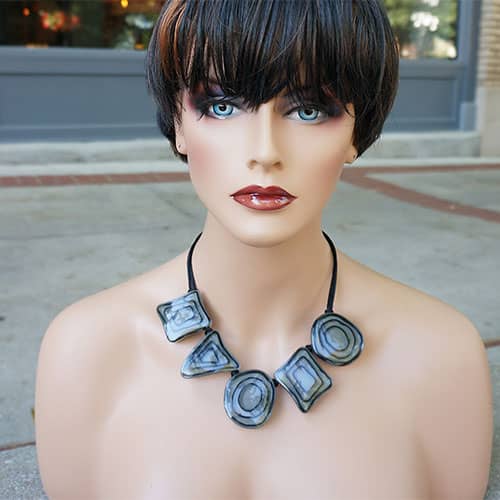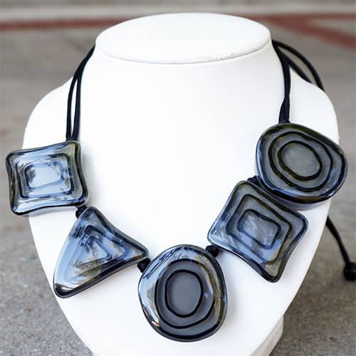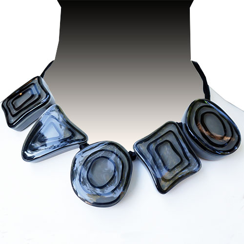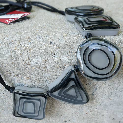 This is not for the faint of heart. The beads are big and take up a lot of neck real estate. There are 5 "beads" averaging 1.5" wide and 1.75" long. They are 1/2" thick. Knotted between each piece. The cord is satin, and it's one of those great adjustable necklaces Zsiska does so well. Please look at the detail photos to see an example of the lengths it can go to...or not.