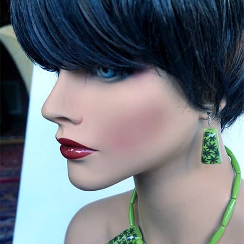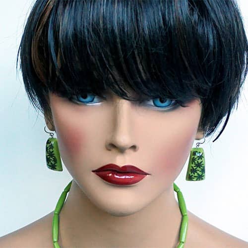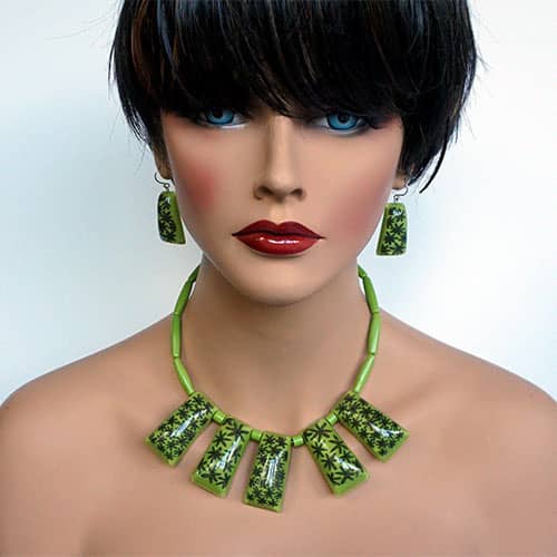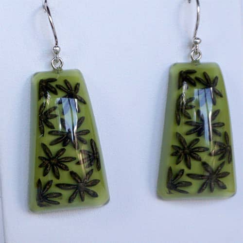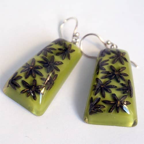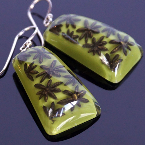 Nice simple earrings, lightweight. Length from center of the ear wire curve is 1.75" with the resin piece being just over 1" long, 10/16" wide at the bottom and .5" wide at the top.
