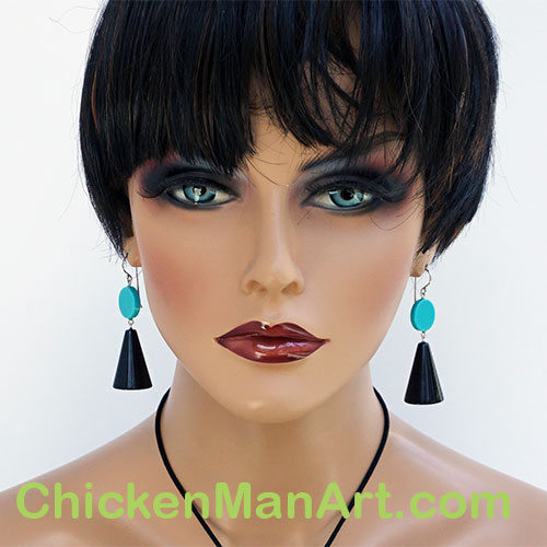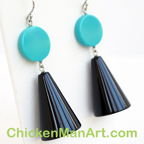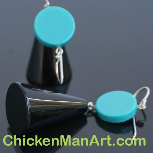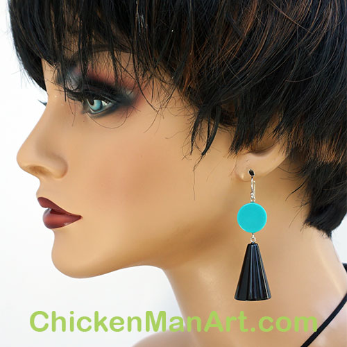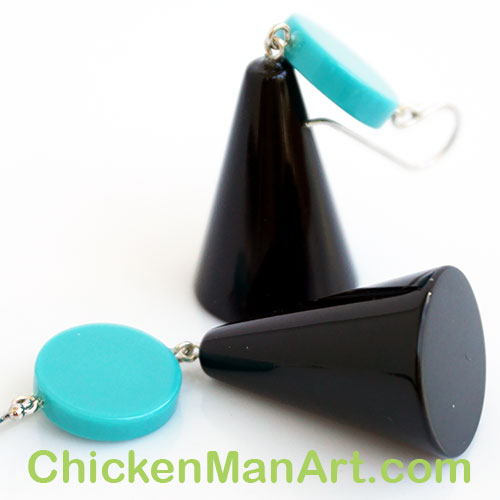 From Zsiska's Memphis Collection. Earrings measure 2.5" from the center of the earwire curve. Cone is 1" long and the turquoise disc is .5" diameter.