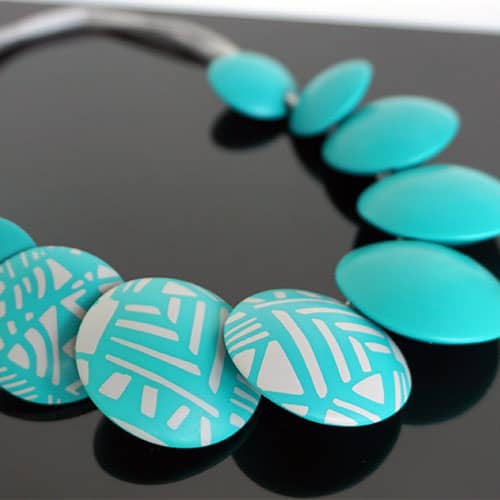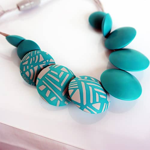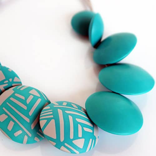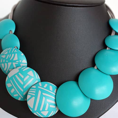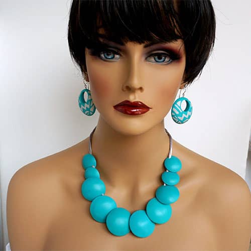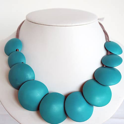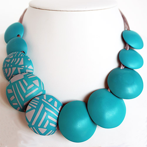 There are 9 "beads". The center pieces are 1.5" diameter and the ones towards the back are 1" diameter. Wear them all to the turquoise side, or as designed with the 3 design beads facing forward. The cord is grey satin and closes with a magnet. Not adjustable. 19" long. Please look at the detail photos to see how it falls when worn.