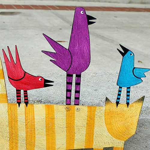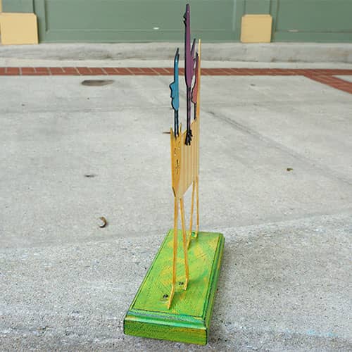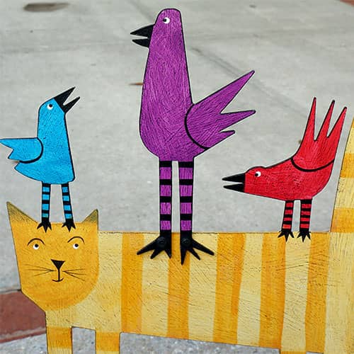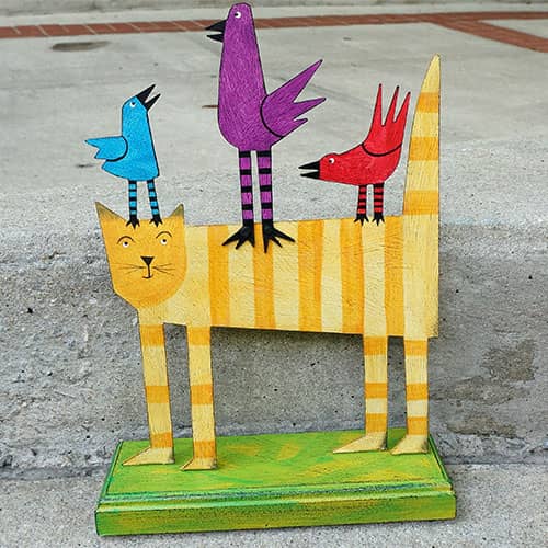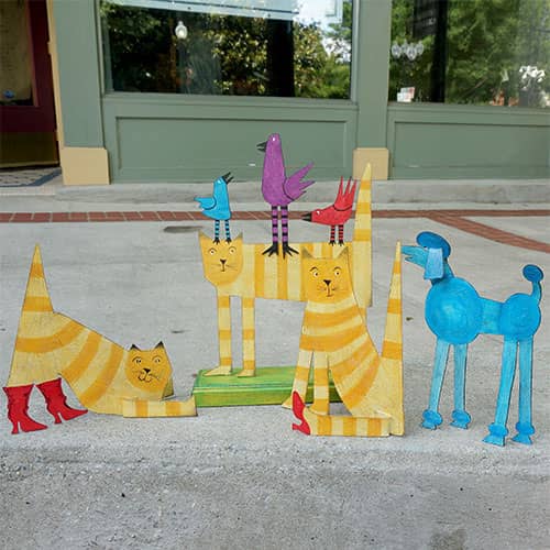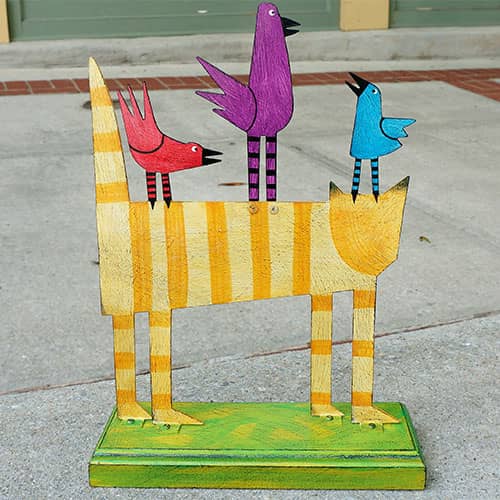 Those with an eye for the quirky will delight in the sculptures of artists Sue Parke and Don Gidley … her sense of whimsy, and Don"s eye for geometry and line merged in Acme Animal – clocks, shelves, and candleholders that come in eclectic shapes like animals, veggies, and weather vanes. In a studio filled with rivets, scroll saws, and sheets of aluminum, Don cuts and Sue paints. She uses bold combinations of colour to give the pieces life using brushstrokes adapted from stage painting (The pair met while working on theatre sets)