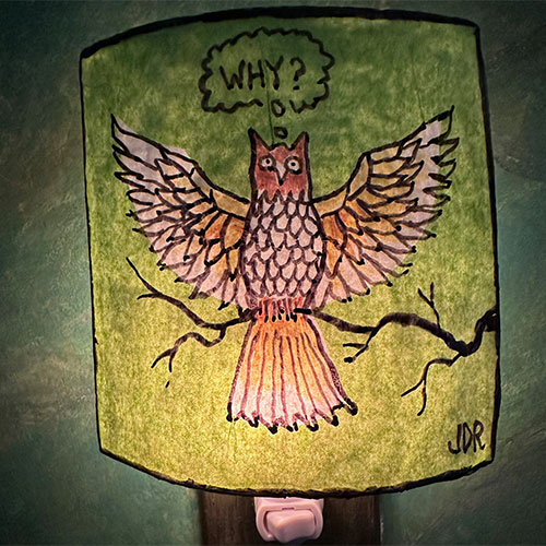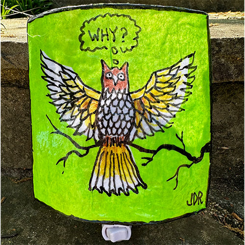 Sometimes a room needs a little light, and lots of personality. John's lamps will force a smile out of you 'cause they are just so darn much fun. Presented for your consideration; John's version of a night light. Created with vinyl-ized (is that really a word?) paper over a wire frame. U.L. approved lighting fixture. Each is handmade & therefore unique. Art work, averages 6" x 6". You receive the light pictured. Sorry my night shots leave a lot to be desired. Not going to do them over.