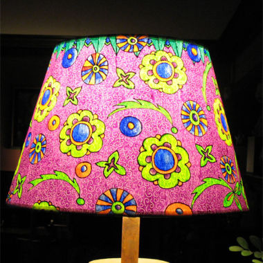 Shade measures 9.5" tall, dia at top is 9", at bottom 14". This shade has a washer fixture, so that means it sits on a harp assembly. This shade works for a table lamp base. This will require shipping in a double box
