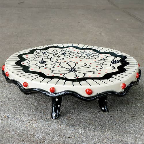 Hand formed and sculptured round tray with rolled legs and attached ball foot, scallop skirt and raised ball embellishment. A great tabletop accessory for your afternoon tea. Serve your pound cake, your homemade cookies, that "homemade" cake you picked up on the way home. it's all up to you. Tray is about 9" diameter and 2" tall. You receive the piece pictured in the detail photos.