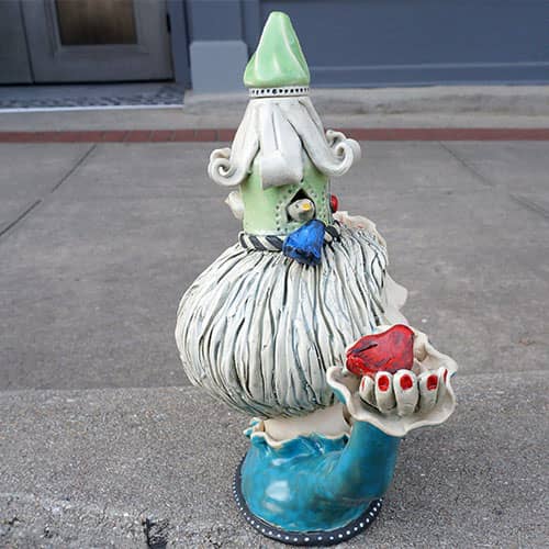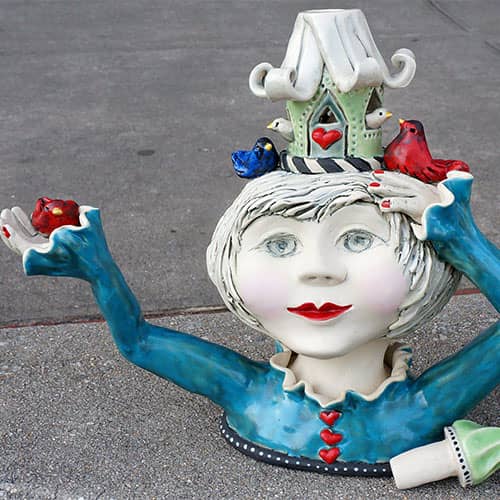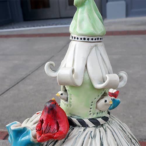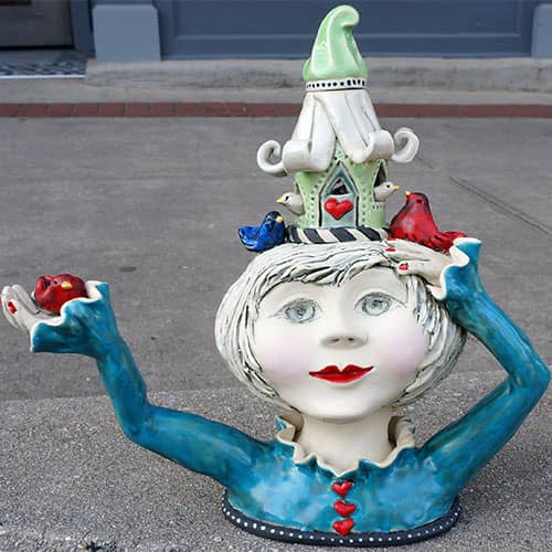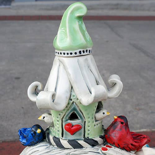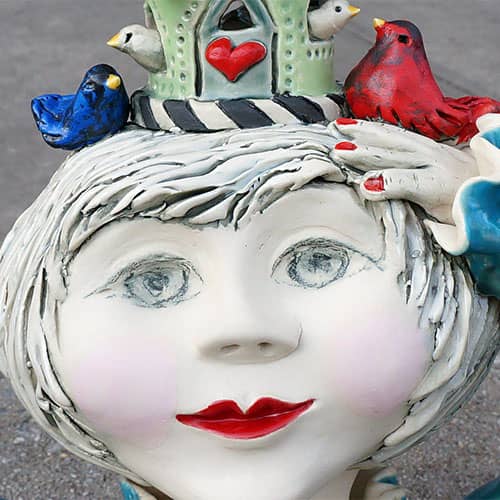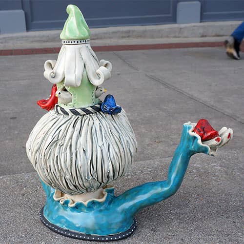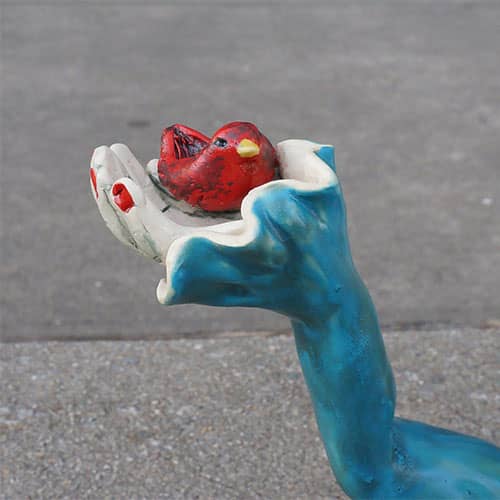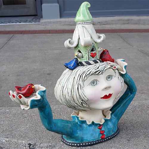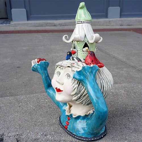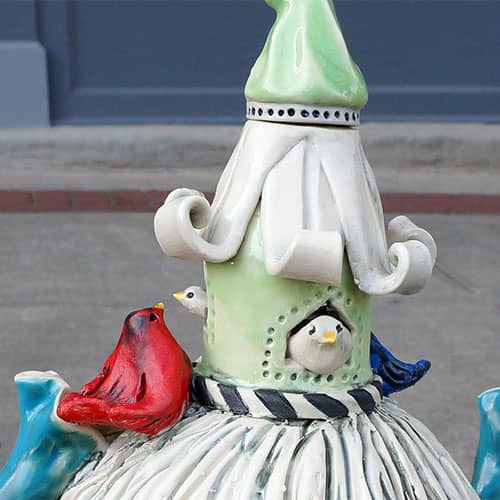 This hand formed and sculpted teapot features a bird house headwear with several birds perching. One arm is the spout and the other is the handle. 11" tall including the birdhouse. 11" from hand to elbow. 5" x 3.5" bottom.