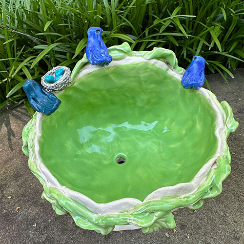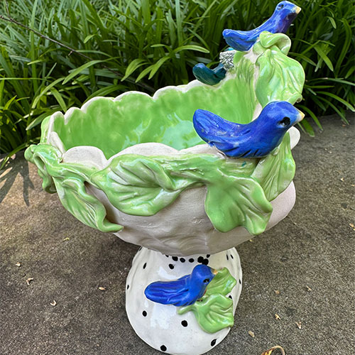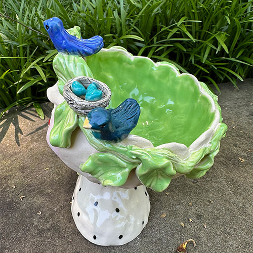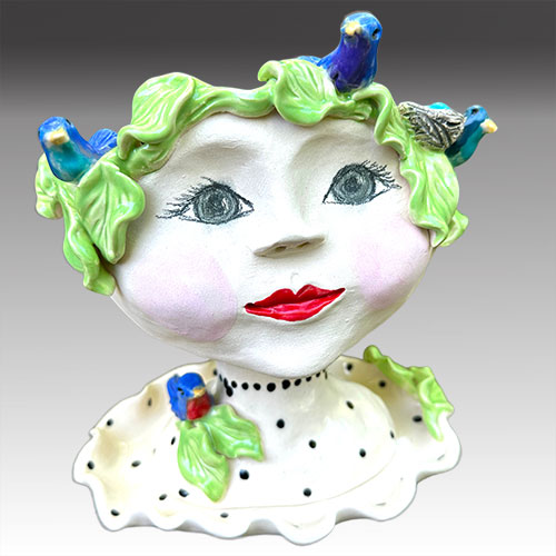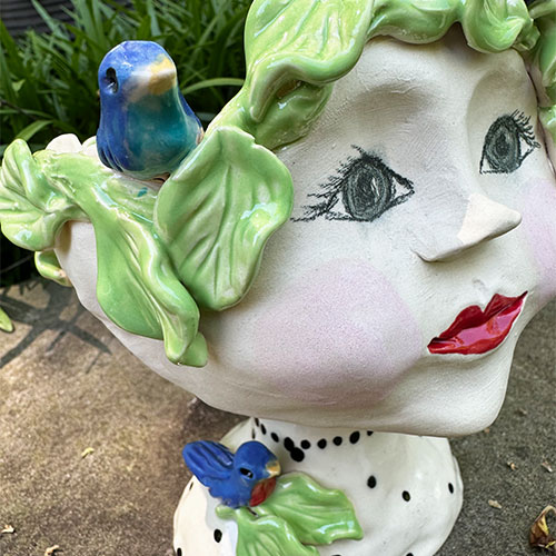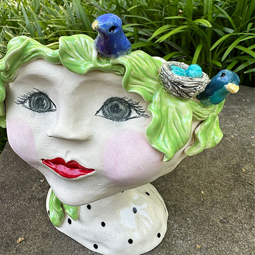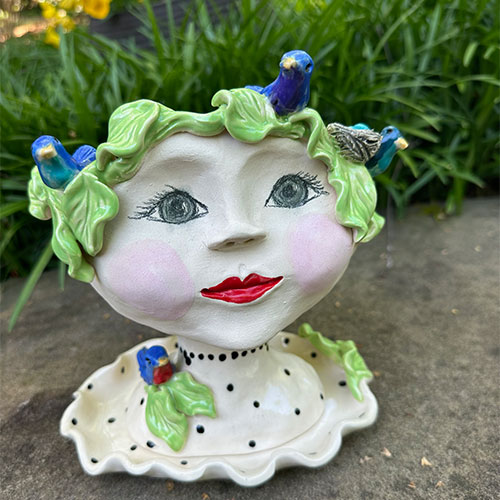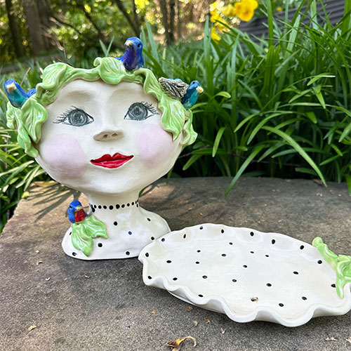Hand sculptured planter glazed in bright pastels on the inside and matte glaze on the outside. Food safe inside. Great presentation for cotton balls, soap, candies, nuts, mini plants, etc. The planter head is 7.5" tall with a 4.5" x 3.5" base and 6" x 4.25" top opening. The tray is 7.5" x 5". We no longer have this beauty on the shelf ready to ship however Cindy will lovingly recreate her and ship directly from her CA studio.