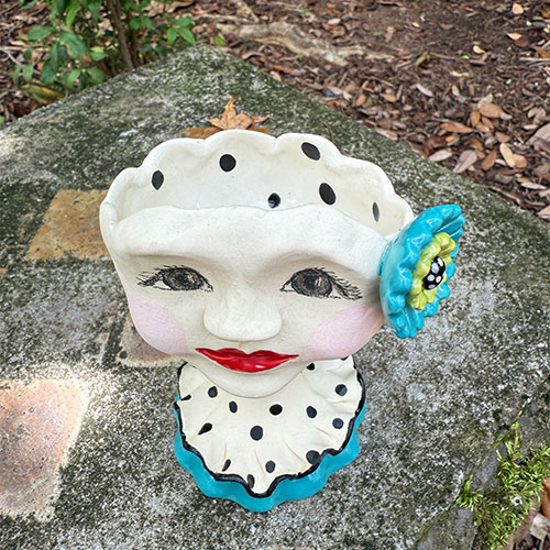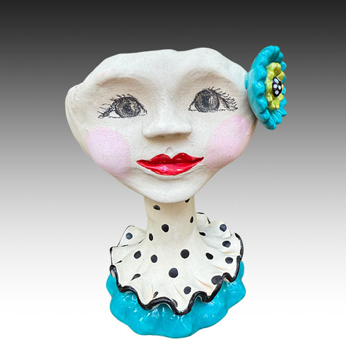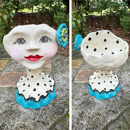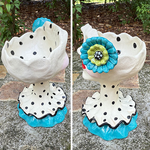 Hand sculptured stemware glazed in bright pastels on the inside and matte glaze on the outside. Food safe inside. Great presentation for cotton balls, soap, candies, nuts, mini plants, etc. This piece is 5" tall with a top opening of 2.5" x 3" and a 3" base. This piece is no longer on our shelves available for immediate shipping. Cindy will create one and ship to you directly from her CA studio. Please allow 3-5 weeks from start to finish.