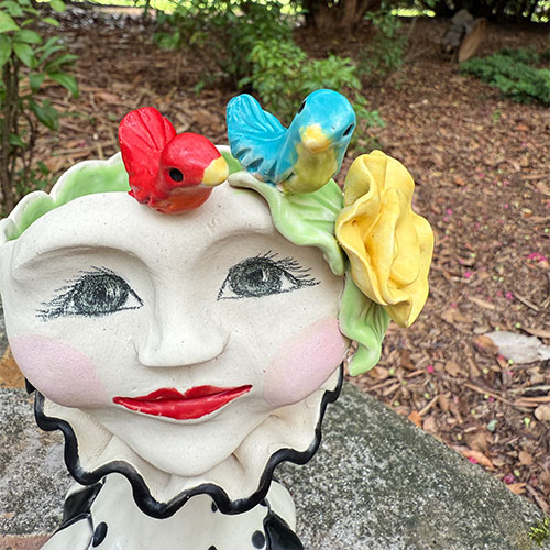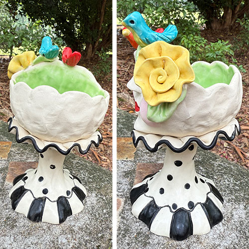 Each piece is glazed in bright pastels on the inside and matte glaze on the outside. Food safe inside. Great presentation for cotton balls, soap, candies, nuts, mini plants, etc. The piece is 7" tall with a 3.75" base and a 4" x 3"" top opening.