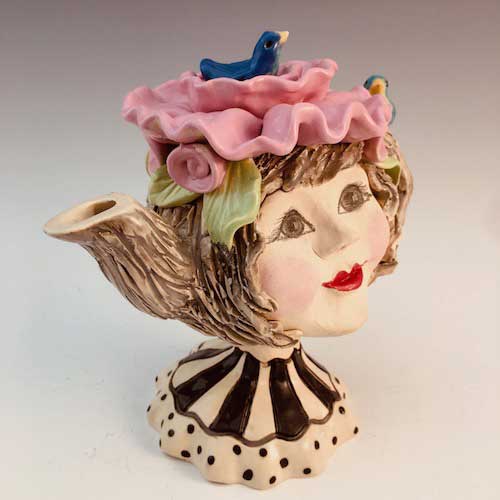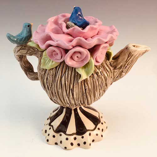 This hand formed and sculpted teapot finds a couple of sweet birds nesting. 7" tall, 8" from spout to handle and 4" from front to back.