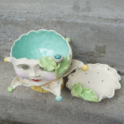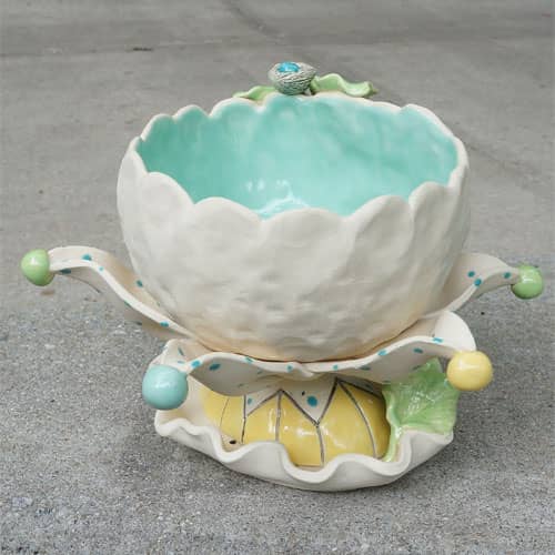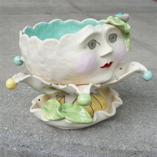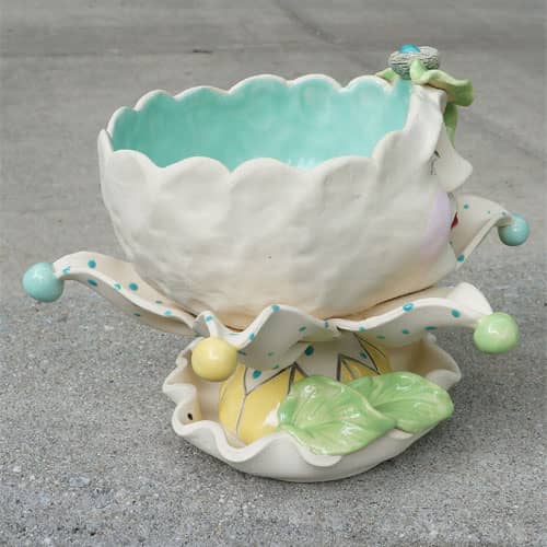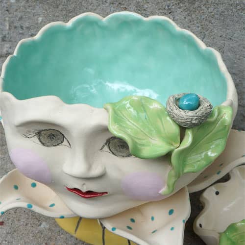 Hand formed and sculptured mini planter with water tray embellished with the matching planter theme. The planters have a small drain hole to watering plants. Outside is glazed in stains and matt glazes and the inside is a bright pastel glossy glaze which is food safe. Though made for homes for small plants these little muses are charming for holding cotton balls or soaps. Because of the food safe interior they are also great table top accessories for candies, bread sticks, nuts, etc.