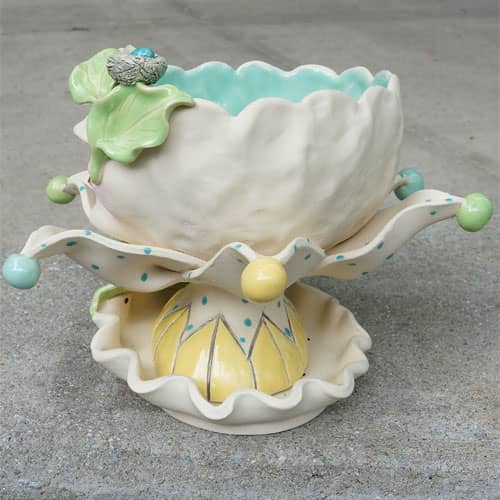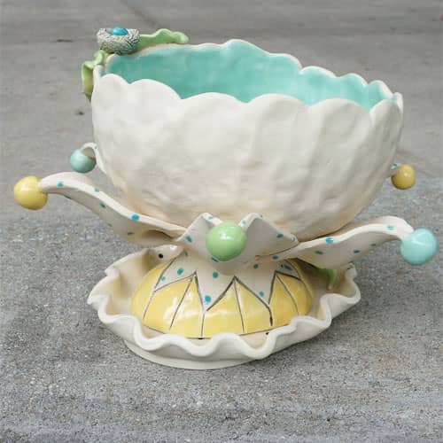 Hand sculptured stemware glazed in bright pastels on the inside and matte glaze on the outside. All hand formed. Food safe inside. Great presentation for wine or Champagne glasses cotton balls, soap, candies, nuts, mini plants, etc. Although the pieces are microwave and dishwasher safe, their delicate nature practically mandates hand washing as a preferred cleaning method.