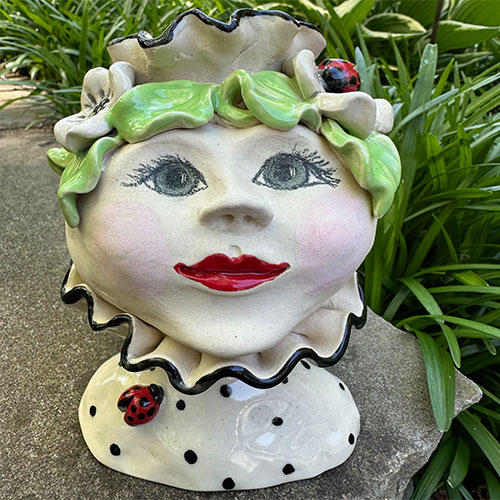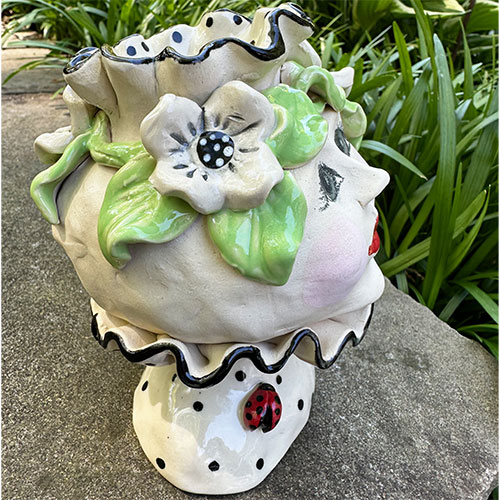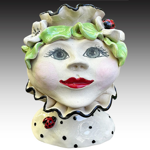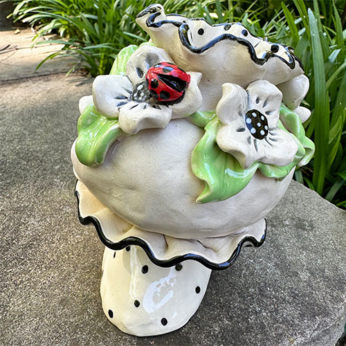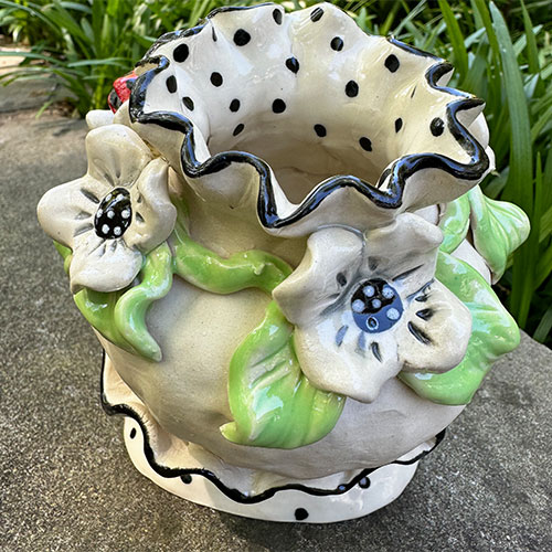 Hand sculpted vase embellished with daisy-like flowers, plus a ladybug. Can also be used in the bathroom for fun toothbrush holders. About 6" tall and 4" wide x 2.5" at the bottom.